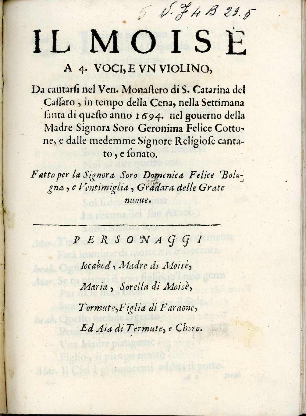 Dal libretto possiamo ottenere ulteriori informazioni, ad esempio riguardo all’occasione esecutiva. Quest’ultima fu la celebrazione della Cena del Signore, che aveva luogo il Giovedì Santo, dando inizio al solenne triduo pasquale durante il quale commemorava la passione, morte e resurrezione di Cristo. Inoltre, pur non essendo noti né il compositore delle musiche né l’autore del testo, sappiamo che l’opera fu dedicata a Domenica Felice Bologna Ventimiglia, appartenente a una delle famiglie di maggiore spicco a Palermo. Oltre alla dedicataria dell’opera, il frontespizio fa riferimento alla priora del monastero, Girolama Felice Cottone, esponente di un clan di pari lignaggio, che in quegli anni fu in prima linea per l’ampliamento della dotazione artistica dell’istituzione, avviando ad esempio la decorazione del presbiterio sotto la direzione di Giacomo Amato.